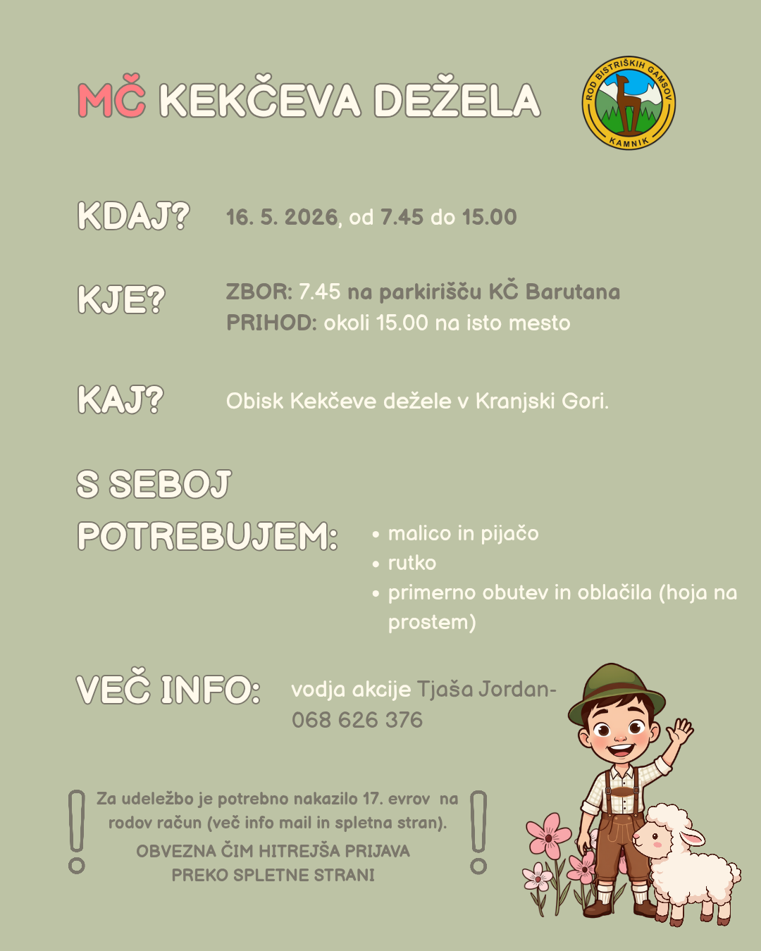 Prijave potekajo izključno preko elektronske prijavnice, ki jo najdete spodaj ⬇️. Prijave sprejemamo do 15. 4. 2026, oz. do zapolnitve mest. Ob prijavi pa je potrebno na rodov račun nakazati 17 evrov za vstop v Kekčevo deželo.