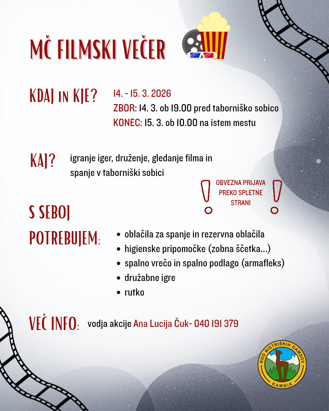 Filmski večer bo potekal od 14. 3. do 15. 3. 2026. Zbrali se bomo 14. 3. ob 19.00 pred taborniško sobico, kjer se bo akcija nasledni dan ob 10.00 tudi končala.