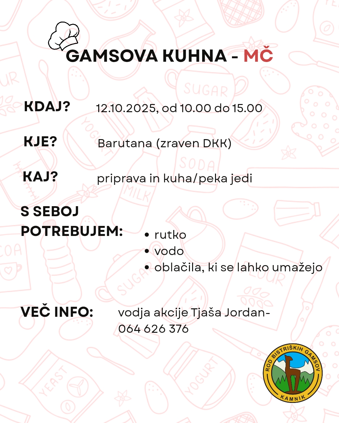 Pridruži se nam v nedeljo,12. oktobra 2025, od 10.00 do 15.00, na akciji "Gamsova kuhna," ki bo potekala v Barutani, ob Domu kulture Kamnik. Otroci bodo skozi to zabavno in poučno aktivnost pridobili osnovne kuharske spretnosti na prostem. Naučili se bodo pripravljati preproste, a okusne jedi na odprtem ognju, hkrati pa spoznali pomen timskega dela in organizacije.🥘