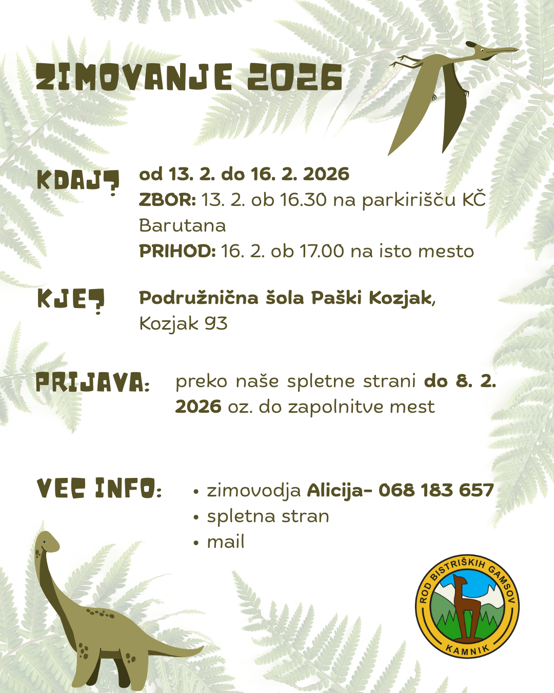 Z veseljem sporočamo, da se približuje naše Zimovanje 2026, ki bo letos potekalo na temo Jurskega parka. V pričakovanju, da nas bodo spremljale prave zimske razmere s snegom, pripravljamo nepozabno dogodivščino, polno taborniških veščin in zabave.