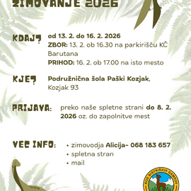 Zimovanje bo potekalo v podružnični šoli Paški Kozjak, od petka,13. 2. 2026, do ponedeljka, 16. 2. 2026. Zbor je pred Kreativno četrtjo Barutana (makadamso parkirišče) ob 16.30, povratek pa v ponedeljek okoli 17:00 na isto mesto.